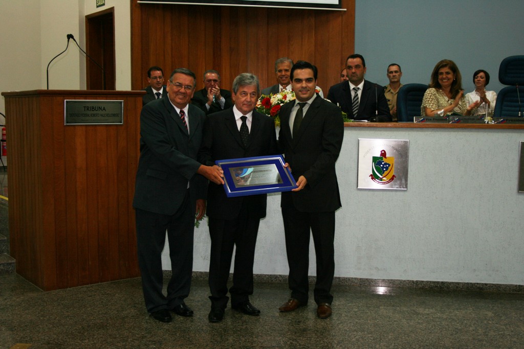 Foto 02: Primeiro homenageado da noite, Dr. Luís Henrique Leite Nogueira, recebendo a Medalha XV de Abril em reconhecimento ao notável trabalho desenvolvido na área da saúde em Jales, ladeado pelo vereadore Luís Rosalino e vereador Gilberto Alexandre de Moraes, autor da propositura da concessão.