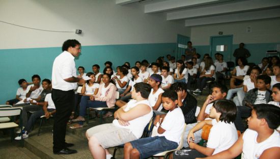 Aproximadamente 80 alunos das 7ª séries 1 e 2 participaram da atividade "Câmara na Escola", realizada na manhã da última quarta-feira, 21 de março, às 08h30 em um dos auditórios da escola. Segundo o professor Osmar, o trabalho faz parte de um estudo sobre o Iluminismo e abrange a história dos poderes Executivo, Legislativo e Judiciário. "Desde o início desse ano letivo estamos trabalhando o tema Iluminismo e chegou a hora de falar sobre os poderes Executivo, Legislativo e Judiciário. A princípio, alguns alunos foram até a sede da Câmara Municipal conhecer as instalações da Casa e se aprofundar no tema, conhecendo de perto como é o trabalho de um vereador. Como não foi possível enviar todos os nossos alunos, convidamos o vereador Luiz Henrique Viotto para vim até nossa escola e falar com nossos alunos", explicou o professor.