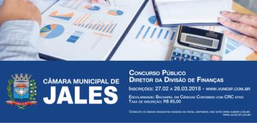 Concurso público da Câmara tem 59 inscritos05 de April de 2018Terminaram na quinta-feira, 28 de março, as inscrições para o concurso público da Câmara Municipal de Jales. Foram realizadas 184 inscrições, das quais 59 foram pagas e deferidas aos candidatos que vão concorrer a uma... -